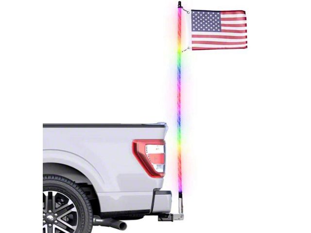 Innovative Illumination. The Master Tailgaters 5-Foot Spiral Chasing LED Flag Pole with Hitch Mount revolutionizes how vehicles can display flags and communicate on the road. It not only serves as a vibrant display of patriotism or team spirit but also enhances safety with its additional brake light and turn signal functionality. This product, with its 20 different colors and 100 lighting modes, allows for personalized lighting experiences for any vehicle.