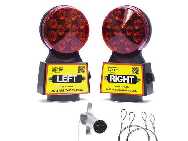 Wireless Trailer Tow Lights. The Master Tailgaters Wireless Trailer Tow Lights are designed for maximum brightness and convenience with 12 LED diodes. These lights serve as brake lights, turn signals, and hazard lights, providing a versatile solution for towing, emergencies, or additional visibility. Wireless functionality ensures a range of up to 65 feet, making it ideal for a variety of applications.