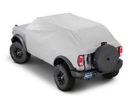 Quick Car Coverage. Park your Bronco in style and security with this MasterTop Full Door Cab Cover; Gray Denim. Made from strong synthetic fabric, it is a soft composite material that leaves no scratches and features five strong layers to give lightweight dampening against particles as well as block off moisture and UV.
