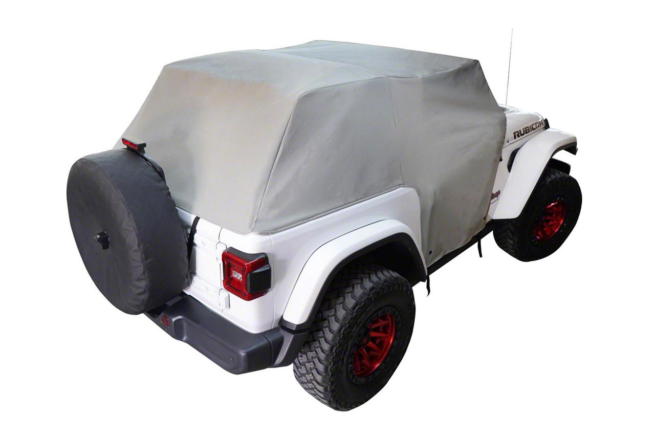 Antimicrobial. The MasterTop Full Door Cab Cover is an ideal choice for those looking for reliable protection for their Jeep Wrangler JL 2-Door model. It is made of high-quality soft top material that is waterproof, antimicrobial, and UV-resistant, ensuring a long-lasting and durable solution. The cover comes in a gray denim color and features full side flaps, providing full coverage for the doors without the need for any drilling or modification.