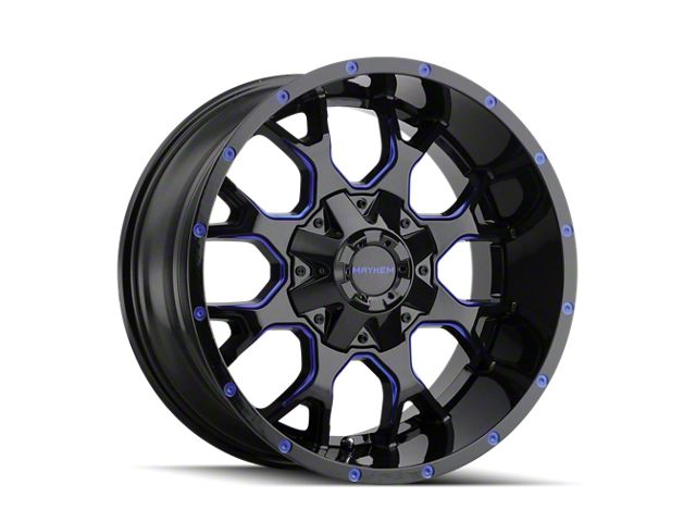 Mayhem Wheels Warrior Gloss Black Milled with Prism Blue Wheel; 18x9; -12mm Offset is a perfect blend of style and rugged design, making it a standout choice for those looking to enhance their vehicle's aesthetic appeal. Its bold, dark metallic finish pairs seamlessly with a wide variety of vehicle styles, offering both modernity and durability. Built by Mayhem Wheels, this wheel is designed to elevate your vehicle's appearance with its robust presence.