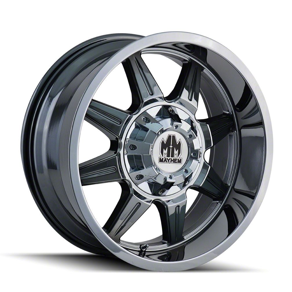 The 22x10 Mayhem Wheels Monstir Chrome 6-Lug Wheel is completed in a high-quality, triple-process chrome finish that will be the envy of everyone. For added protection and good looks, there is a durable clear coat that handles the rigors of daily driving.