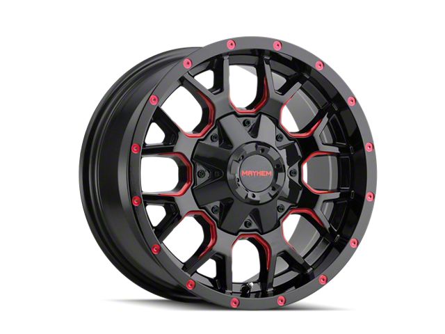 Mayhem Wheels Warrior Gloss Black Milled with Prism Red 6-Lug Wheel; 18x9; 18mm Offset is a perfect blend of style and rugged design, making it a standout choice for those looking to enhance their vehicle's aesthetic appeal. Its bold, dark metallic finish pairs seamlessly with a wide variety of vehicle styles, offering both modernity and durability. Built by Mayhem Wheels, this wheel is designed to elevate your vehicle's appearance with its robust presence.