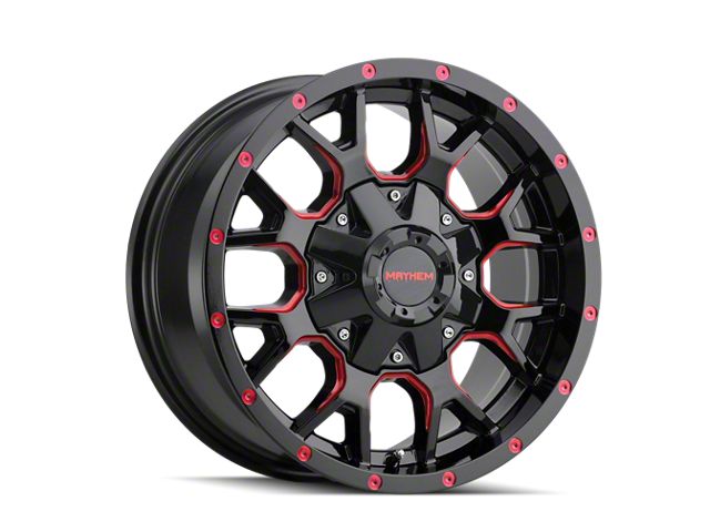Mayhem Wheels Warrior Black with Prism Red 6-Lug Wheel; 20x10; -25mm Offset offers a striking balance between style and durability. The design speaks to the brand's commitment to quality, enhancing the vehicle's appearance with its distinct look. This wheel, with its unique aesthetics, is ideal for drivers who appreciate a blend of modern design and robust functionality.