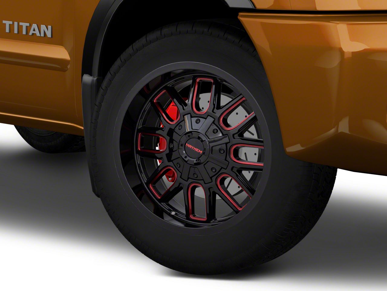 Application. This Mayhem Wheels Cogent Black with Prism Red 6-Lug Wheel; 20x9; 0mm Offset with a backspace of 5 Inch, 127mm and bolt pattern of 6 x 139.7mm (6 x 5.5-Inch) ensures optimal alignment, unparalleled driving stability, and an impeccable fit with your vehicle. It is designed to fit the 2004-2015 Titan models. Sold individually.