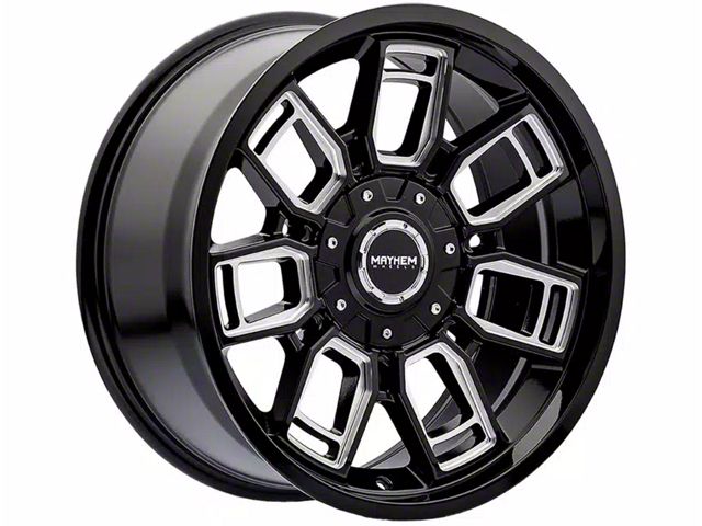 The 20x9 Mayhem Wheels Ordinance Gloss Black Milled 6-Lug Wheel is completed in a high-quality gloss black finish, with steel milled accents. Thanks to a durable clear coat, the finish looks amazing and also protects against the rigors of driving.