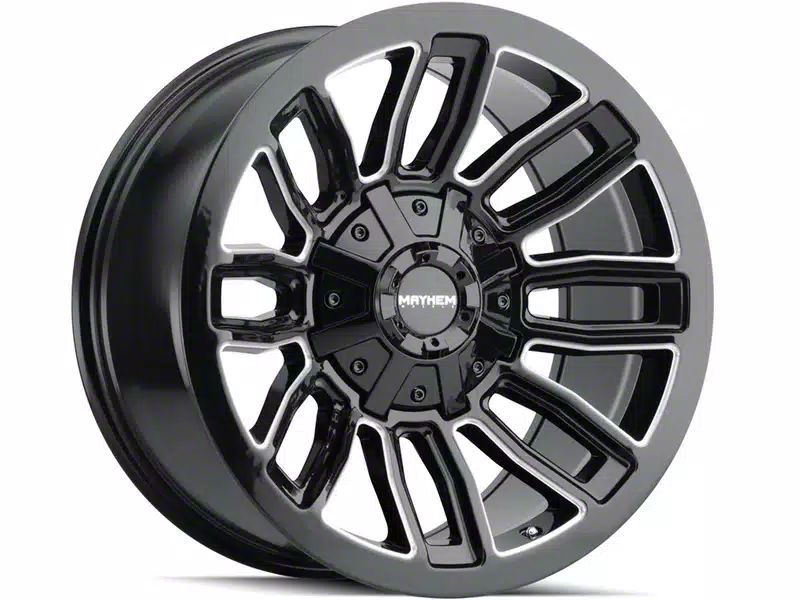 This 20x9 Mayhem Wheels Decoy Gloss Black Milled 6-Lug Wheel is completed in a high-quality gloss black finish with steel milled accents that will create a striking appearance. There's a durable clear coat that protects against driving hazards.