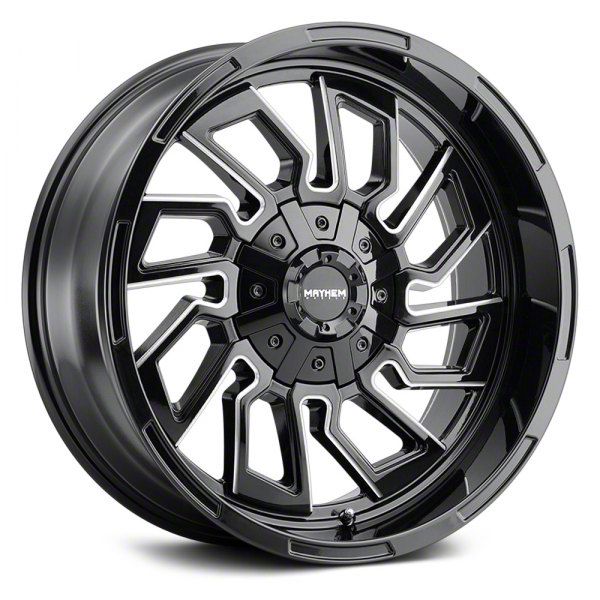 This 20x9 Mayhem Wheels Flywheel Gloss Black Milled 6-Lug Wheel is completed in a high-quality gloss black finish with steel milled accents that will be the envy of everyone. There's a durable clear coat that protects against driving hazards.