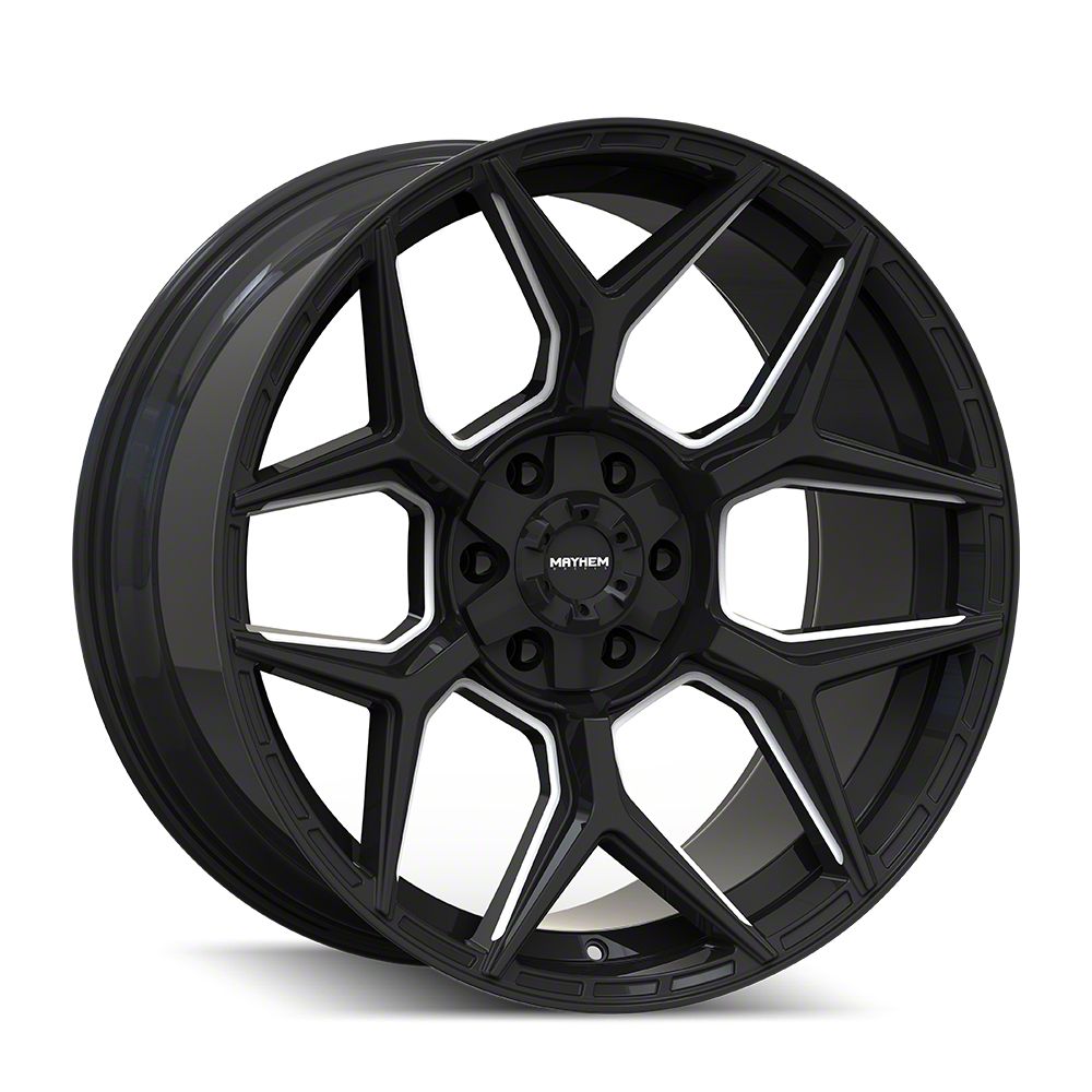 The 22x10 Mayhem Wheels Vanquish Gloss Black Milled 6-Lug Wheel is completed in a high-quality gloss black finish with milled accents. For added protection and good looks, this Wheel features a durable, matte clear coat that is tough enough to stand up against the hazards of everyday driving.