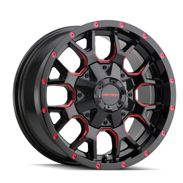 Mayhem Wheels Warrior Gloss Black Milled with Prism Red Wheel; 17x9; -12mm Offset is a perfect blend of style and rugged design, making it a standout choice for those looking to enhance their vehicle's aesthetic appeal. Its bold, dark metallic finish pairs seamlessly with a wide variety of vehicle styles, offering both modernity and durability. Built by Mayhem Wheels, this wheel is designed to elevate your vehicle's appearance with its robust presence.
