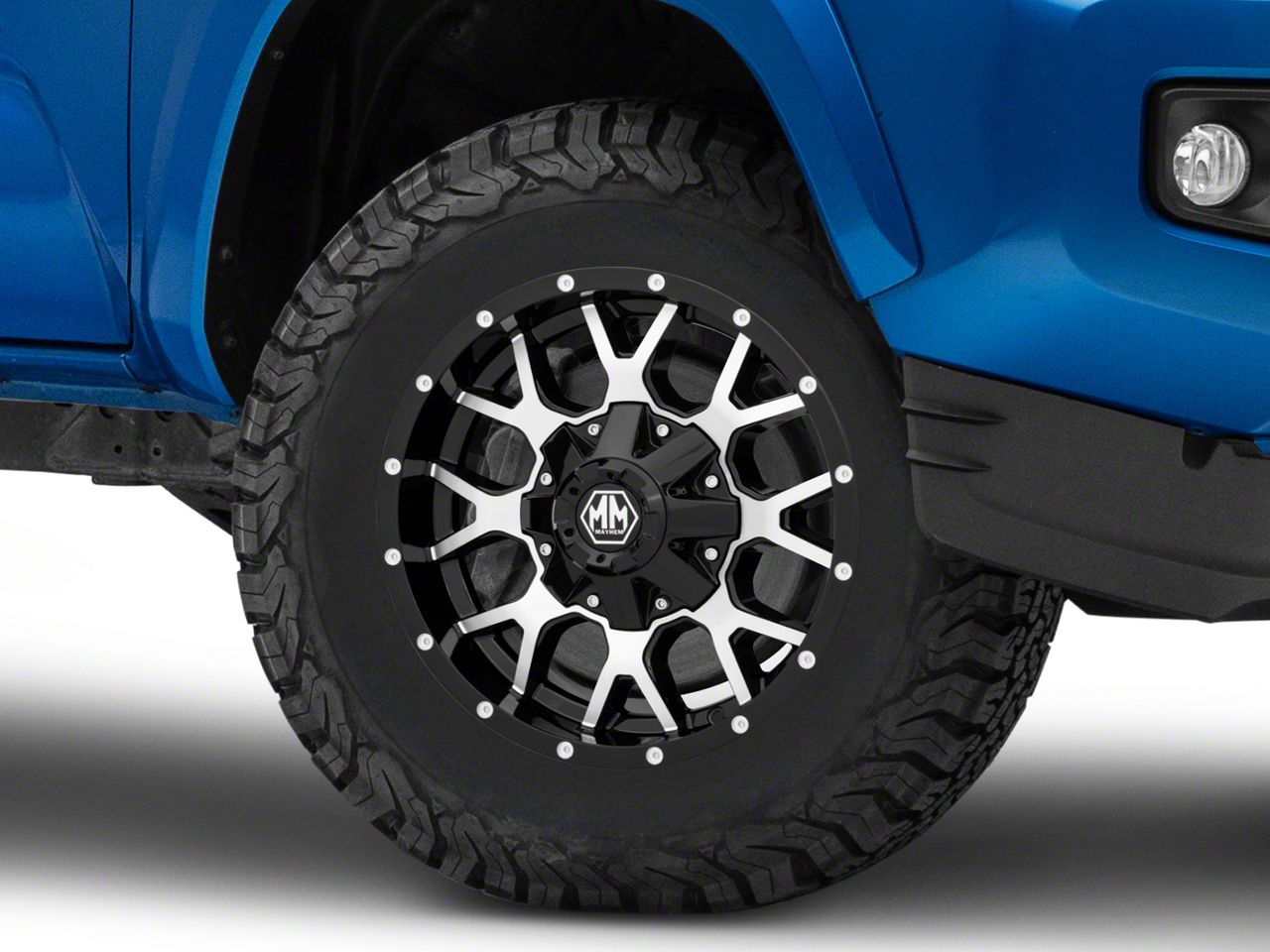 Application. This Mayhem Wheels Warrior Black Machined 6-Lug Wheel; 17x9; 18mm Offset, with a backspace of 5.709 Inch, 145.1mm and bolt pattern of 6 x 139.7mm (6 x 5.5-Inch), ensures proper alignment and stability. It's designed to fit the 2016-2023 Tacoma models, enhancing both the look and the overall driving experience. Sold individually.