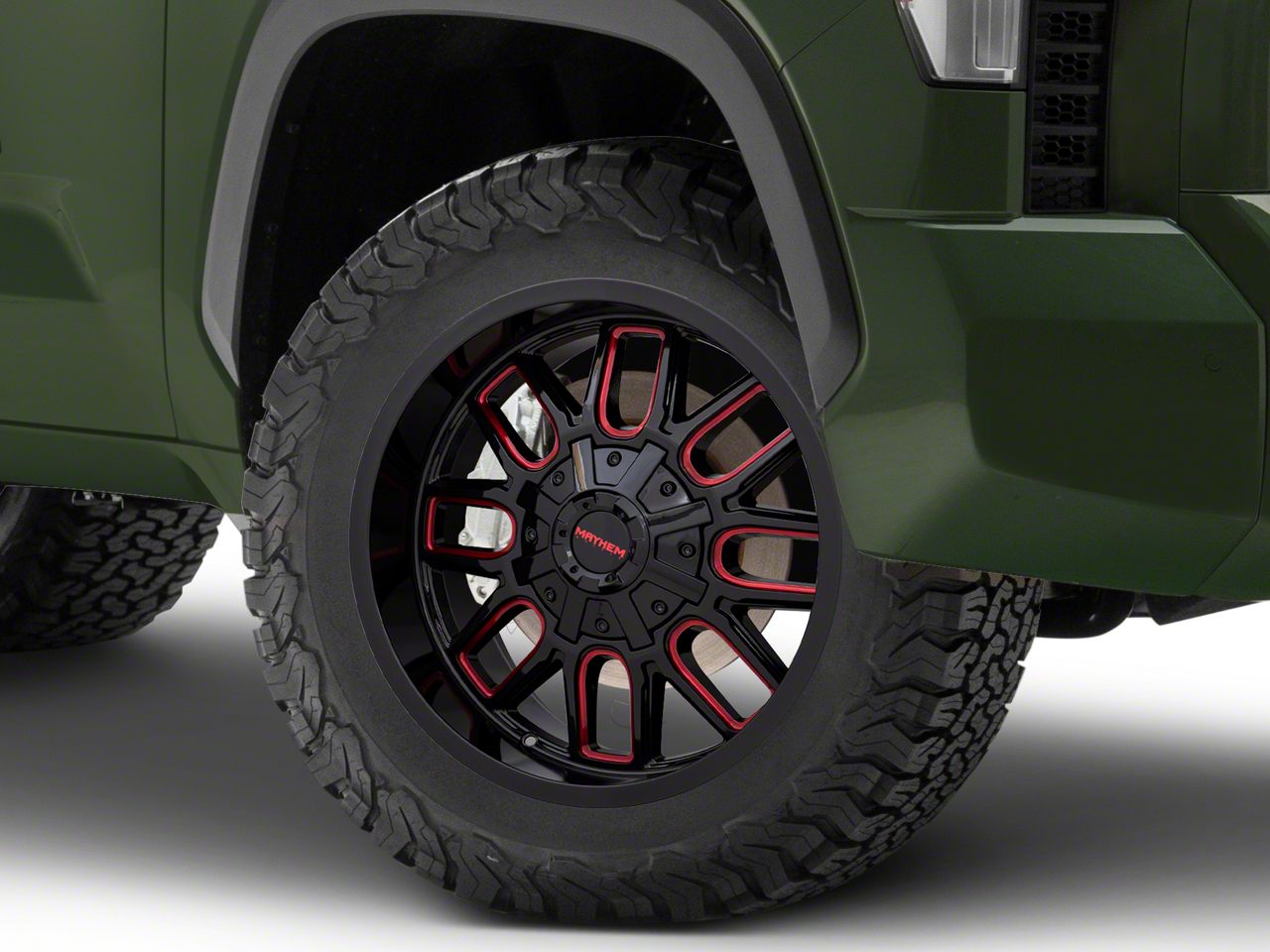 Application. This Mayhem Wheels Cogent Black with Prism Red 6-Lug Wheel; 20x9; 0mm Offset with a backspace of 5 Inch, 127mm and bolt pattern of 6 x 139.7mm (6 x 5.5-Inch) ensures optimal alignment, unparalleled driving stability, and an impeccable fit with your vehicle. It is designed to fit the 2022-2026 Tundra models. Sold individually.