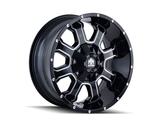 This 20x9 Mayhem Wheels Fierce Gloss Black Milled 5-Lug Wheel is completed in a high-quality gloss black finish with steel milled accents that will create a striking appearance. There's a durable clear coat that protects against driving hazards.