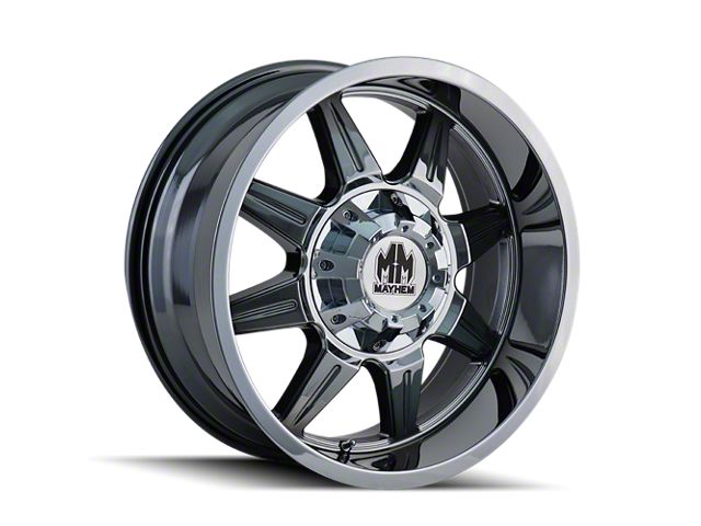 The 20x10 Mayhem Wheels Monstir Chrome 5-Lug Wheel is completed in a high-quality chrome finish that is accomplished in a 3-step process. First is copper to adhere to the wheel, followed by nickel for strength and finally chrome for that amazing look.