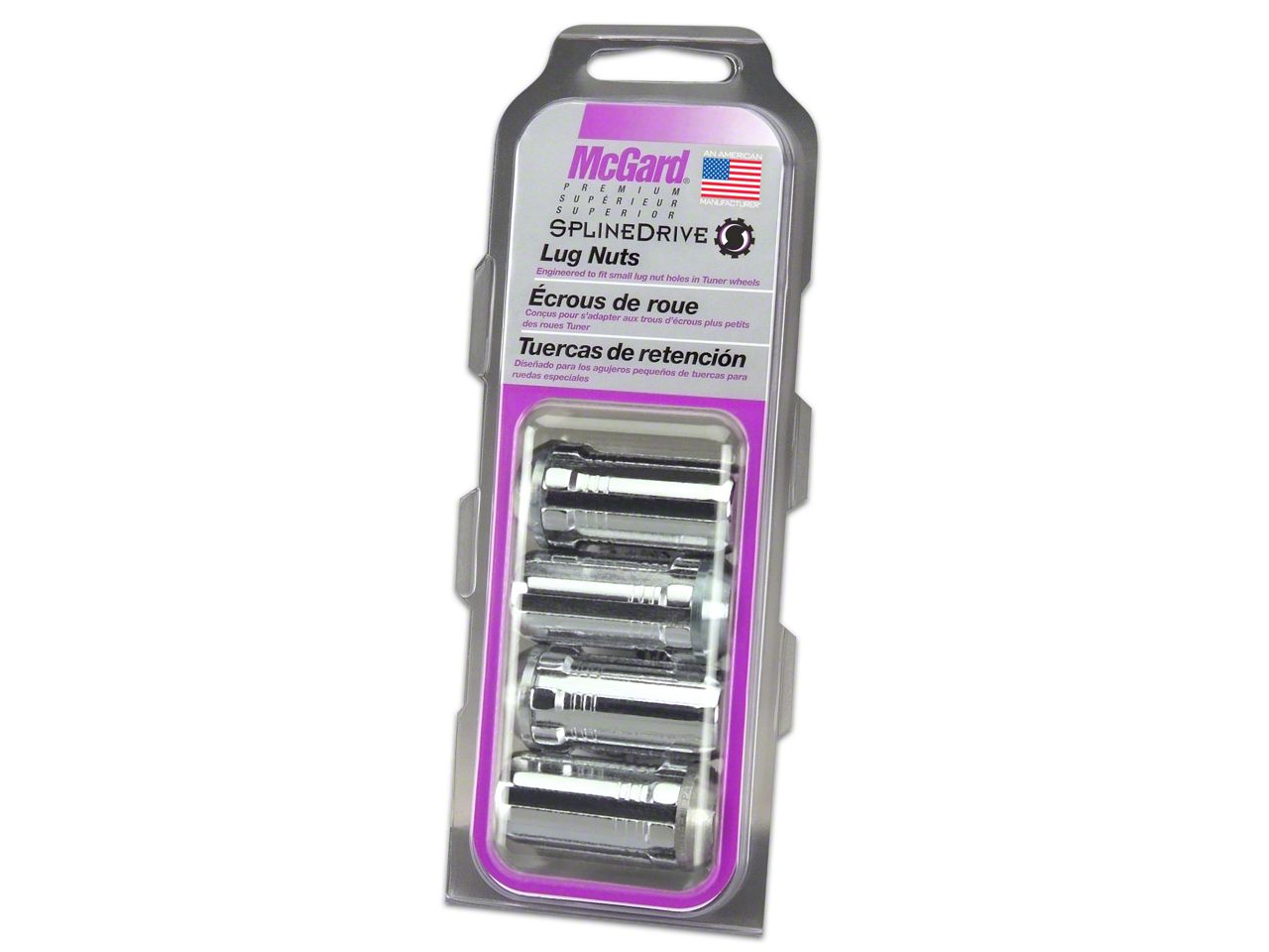 Why settle for ordinary lug nuts? SplineDrive Lug Nuts combine style and performance.; A no-compromise design engineered to fit small diameter recesses in Tuner style wheels.; SplineDrive lug nuts offer closed-end design, maximum gripping power, more stud engagement and a greater seating surface than socket style lug nuts.; In addition they are 30% lighter in weight.; Like all McGard lug nuts, the chrome plating is guaranteed for life not to rust, chip or peel.; McGard manufactures SplineDrive lug nuts in the USA to meet or exceed O.E.M.; standards for safety and durability.; Every lug nut is fully machined from restricted chemistry steel made specifically for McGard and through-hardened for its unsurpassed level of safety.; McGard's plating process includes several layers of nickel and one layer of microporous chrome producing a superior finish while protecting against rust.; SplineDrive lug nuts take safety, dependability and style to the next level.; For aluminum wheels only.; Requires 65301 (1 Hex) or 65302 (22MM Hex) Installation Tool.; This product may contain globally sourced materials/components.