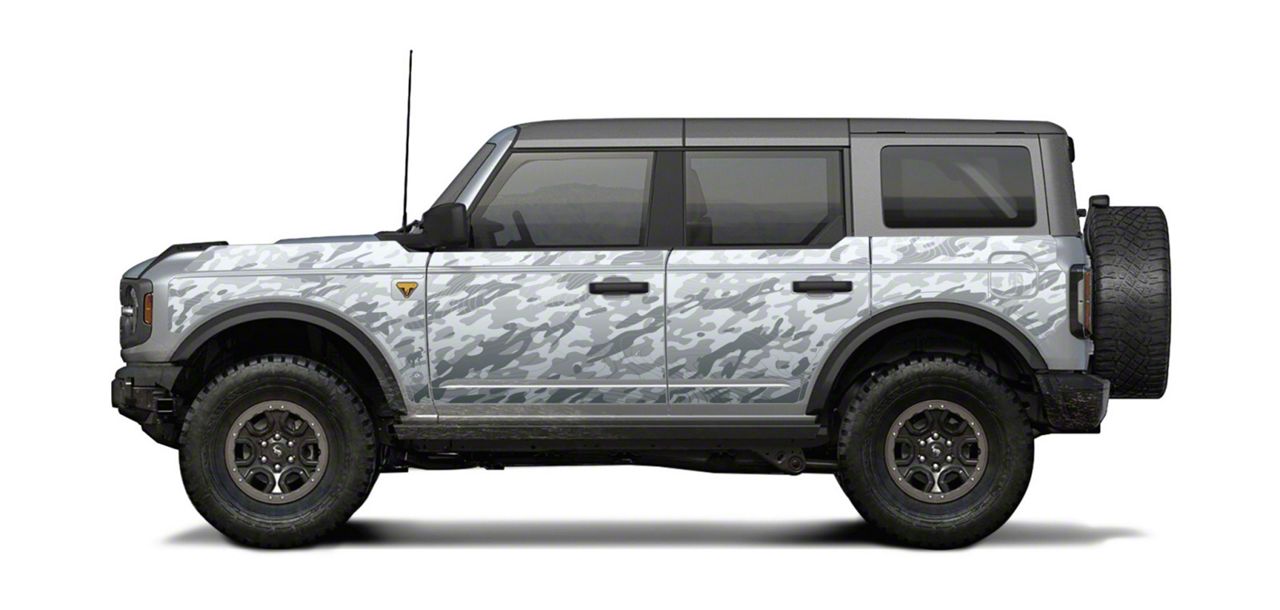 Construction and Appearance. Made from high-quality paint protection vinyl, this body armor is engineered with advanced ballistic resin and Nano-Hold technology. The surface showcases a vibrant Ghost Camo White design, giving your Bronco a bold custom look. The finish is smooth, durable, and built to withstand everyday wear and environmental exposure.