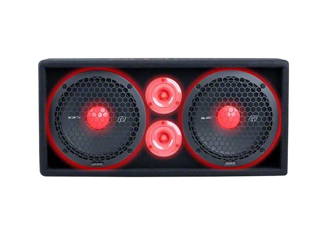 Construction and Appearance. Designed for performance and resilience, this enclosure is wrapped in a rugged bed liner coating with carpeted finish accents. RGB LED lighting on the tweeters and dust caps provides a vibrant visual experience, while the built-in handle and quick disconnects make it easy to transport and install.