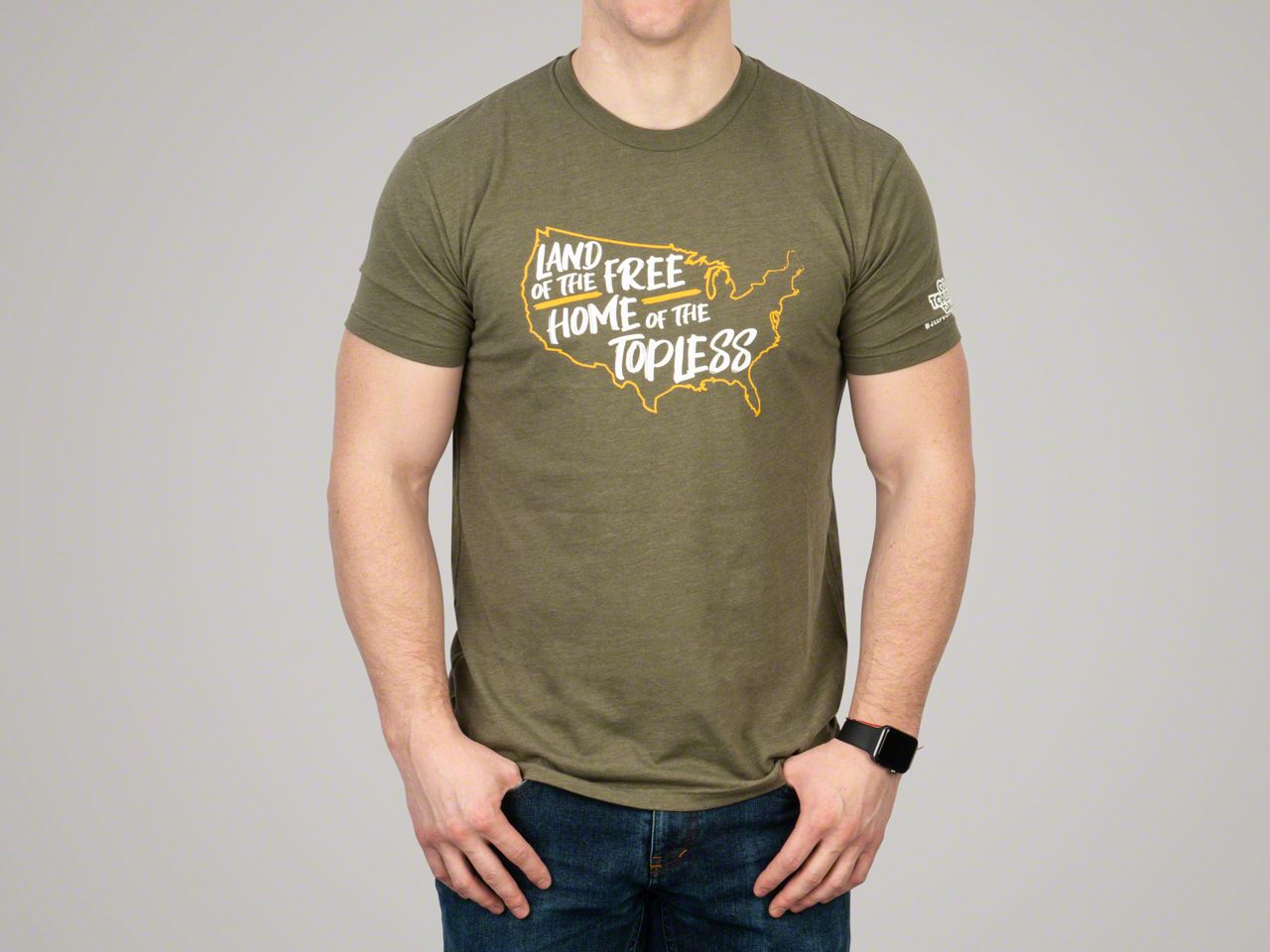 Home of the Topless Design. What better way to show off your enthusiasm for Go Topless Day (May 18th 2026) then by wearing this great looking military green short sleeve T-Shirt. This graphic Tee features the phrase "Land of the Free, Home of the Topless" inside an outline of the United States of America.