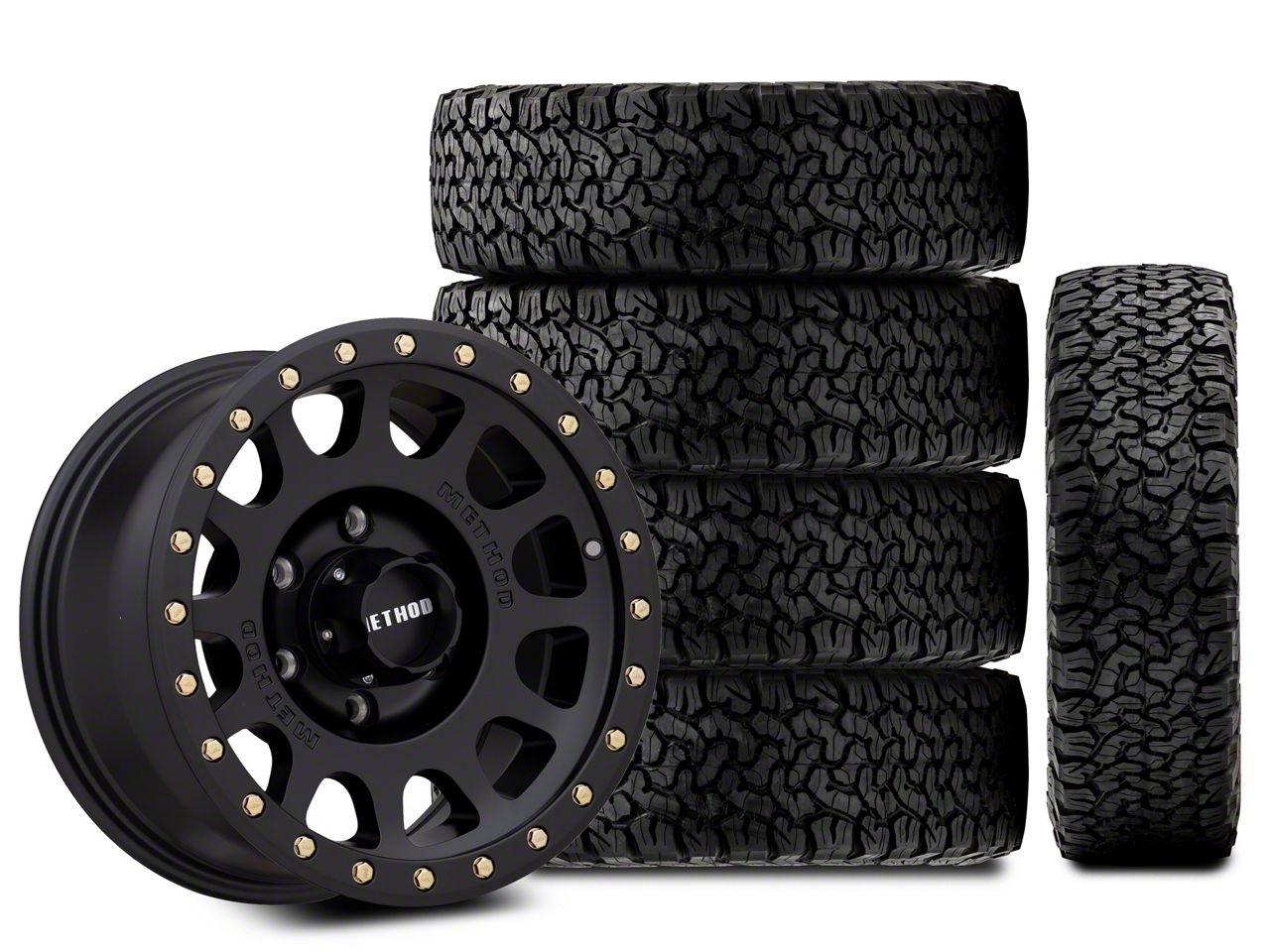 Mounted and Balanced Wheel and Tire Kit. This wheel and tire combo kit features (5) 17x8.5 Method Race Wheels MR305 NV Matte Black 6-Lug Wheels and (5) BF Goodrich All-Terrain T/A KO 285/70R17 tires that have been put together into an easy to buy kit that arrives to your door already mounted and balanced ready to be installed on your vehicle.