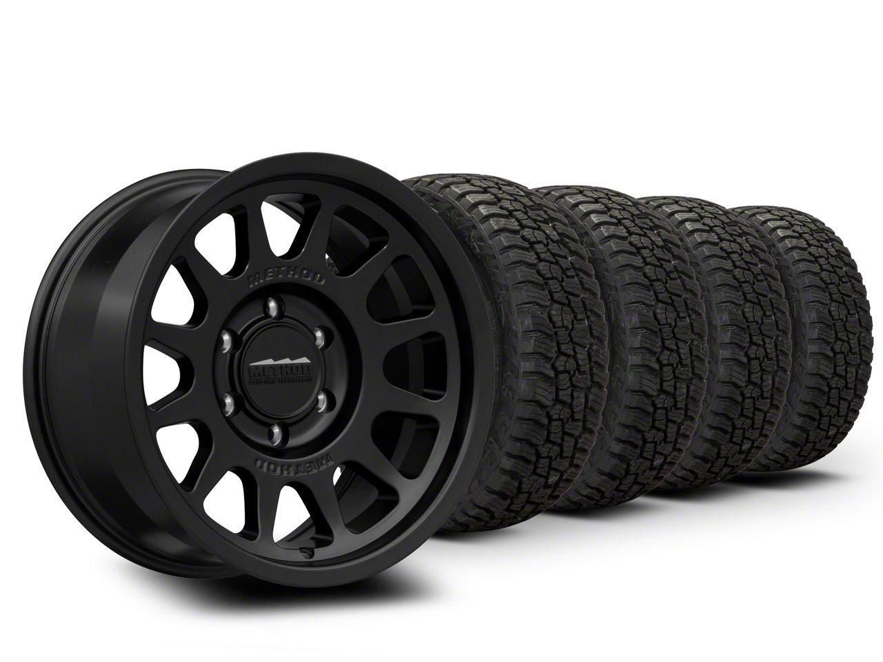 Mounted and Balanced Wheel and Tire Kit. This wheel and tire combo kit features (4) 17x8.5 Method Race Wheels MR703 Matte Black Wheels and (4) Mickey Thompson Baja Boss A/T 35" - 35x12.50R17 tires that have been put together into an easy to buy kit that arrives to your door already mounted and balanced ready to be installed on your vehicle.