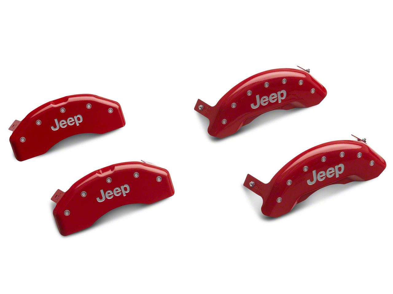 Get Upgraded Curbside Look. Getting an easy curbside appeal upgrade for your Jeep Wrangler is now possible with these MGP Red Caliper Covers with Jeep Logo; Front and Rear. Featuring gloss red finish and CNC-engraved logo with silver inlay, these caliper covers will add a custom element to your vehicle’s wheels. These are engineered and formed to wheel factory wheel clearances and easily hide the discoloration of your old brake calipers.