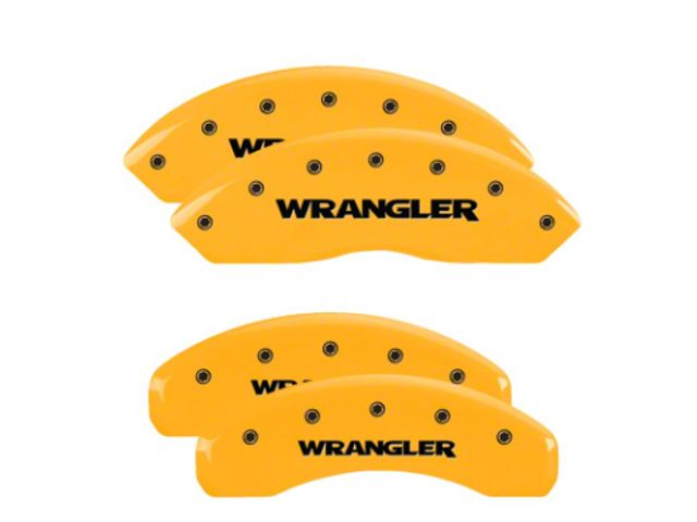 Application. These MGP Yellow Black Caliper Covers with Wrangler Logos are designed to fit all 2018-2025 Jeep Wrangler JL models. Please note that these require wheels with a minimum size of 17 inches.