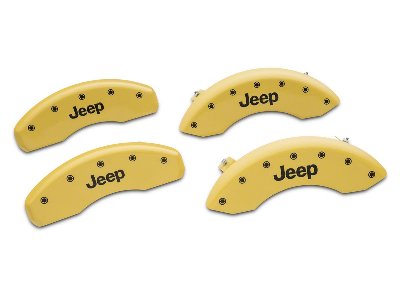 Sleek Custom Appearance. In case you want to give your brake calipers an appearance upgrade , go for MGP Yellow Caliper Covers w/ Jeep Logo - Front & Rear. Their engraved Jeep logo gives them an aggressive and custom appearance.