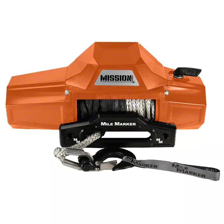 Dependable Functional Design. The Mile Marker 8,000 lb. Mission Winch is a powerful and reliable solution designed to tackle tough recovery situations with ease. Crafted with a durable black synthetic rope and black hook, this winch ensures secure and efficient pulling operations. Made with a 4-bolt pattern, it offers easy installation and compatibility with various mounting systems. The team orange powder-coated finish not only adds a touch of style but also enhances the winch's resistance to corrosion and wear. With an impressive 8,000-pound rating, this winch is equipped to handle a variety of recovery tasks, making it a dependable choice for off-road enthusiasts and adventurers.