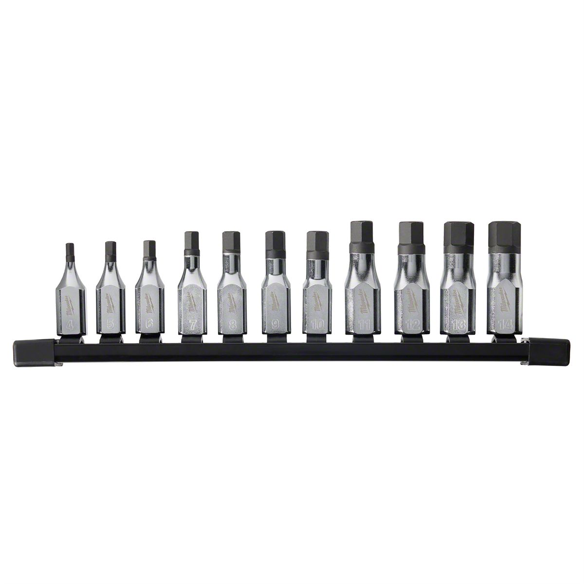 • The MILWAUKEE® 11PC 3/8" Drive Metric Hex Bit Socket Set with FOUR FLAT™ sides is designed from the ground up to be part of the most versatile socket family. Milwaukee® bit sockets feature an innovative design with four parallel flat sides, which deter rolling and are wrench-compatible. This also creates a slim profile to provide the best access in tight spaces. The one-piece socket design offers improved durability compared to two-piece designs by eliminating the risk of the bit separating from the socket base. This set includes a storage rail for better organization. Laser engraved size markings provide easy identification and chrome plating offers rust and corrosion protection. All Milwaukee® bit sockets are backed by a Lifetime Guarantee.