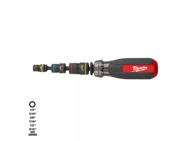The MILWAUKEE® Multi-Nut Driver W/ SHOCKWAVE Impact Duty™ Magnetic Nut Drivers delivers the most versatile nut driving. This multi-bit driver features easy-access on-board storage which keeps nut drivers organized, allowing users to quickly change between sizes. The removable SHOCKWAVE Impact Duty™ 1/4" hex shank is impact ready for maximum jobsite versatility. The nut driver also features ink filled color coded bands for easy size identification. The driver handle is backed by a limited lifetime warranty.