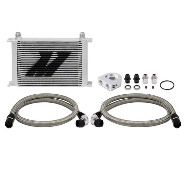 Proper oil temperature regulation is key to extending and preserving the life of your stock or high performance engine.Keep your temperatures in check with the 25-Row Mishimoto Universal Oil Cooler Kit.This kit is applicable for most vehicles and includes all key components for reducing oil temperatures and providing your engine with extra protection against oil degradation.This kit includes a billet anodized aluminum sandwich plate in either standard or thermostatic form.The optional Mishimoto Thermostatic Sandwich Plate provides additional temperature control and will limit oil flow to the cooler until optimal temperatures are reached, making it ideal for those in cooler climates.The included core is our proven Mishimoto 25-row stacked-plate cooler which can wIt'stand high fluid pressures and significantly reduce oil temperatures while exhibiting minimal pressure loss.This kit includes both a 3/4-16 and M20-1.5 sandwich plate adapter which supports fitment for most makes and models.This kit also includes pre-assembled stainless steel braided oil lines with -10AN fittings and dowty seals for durable, leak free connections.Whether you are piloting a boosted rotary or a blown small block, the Mishimoto Universal Oil Cooler Kit will provide the efficiency you need to stay on the track and out of the shop.As with all our products this kit includes the Mishimoto Limited Lifetime Warranty.