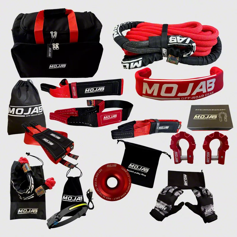 Comprehensive Recovery Kit. The Mojab Offroad Extreme Recovery Kit is an all-in-one solution for off-road enthusiasts, offering a robust and reliable set of tools to handle tough recovery situations. Featuring aluminum shackles, kinetic ropes, and a variety of straps, this kit is designed for maximum efficiency and safety during recoveries.