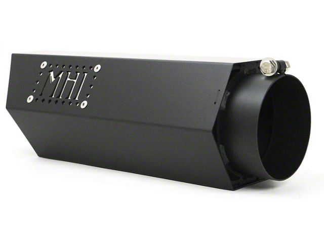 Unique and Stylish. Forget ordinary-looking exhaust tips, stand out from the rest with the Monster Hook 5-Inch Hex Flo Angled Exhaust Tip with Stainless Steel Badge Plate in Black (Fits 4-Inch Tailpipe). This angled exhaust tip has a distinctive hexagonal shape and a vent system that allows ambient air to circulate and interact with the hot gases produced by the DPF system, keeping the tip cold.