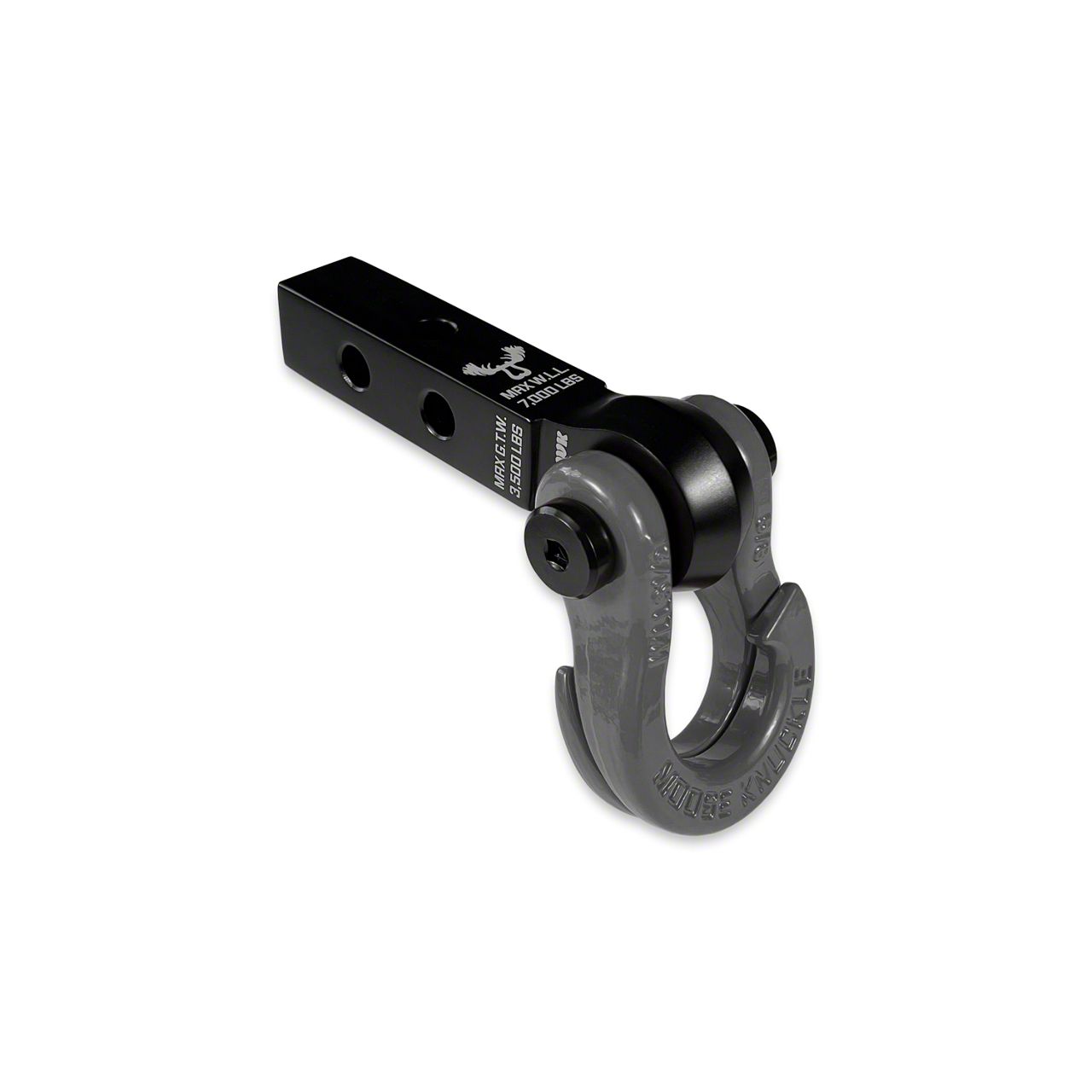 This shackle receiver set up is perfect for your SxS, UTV or ATV with a 1.25 inch hitch tube!JOWL 5/8 SPLIT SHACKLEIntroducing the "patent pending" JOWL SxS 5/8 inch recovery split shackle designed especially for smaller off-road vehicle like SxS's, ATV's and UTV's. Our innovative split "J" recovery shackle design eliminates the need for tools or soft shackles while making rope and strap connections faster eliminating the need to remove your shackles from your bumper or hitch receiver to make a connection, hook up a rope or strap out on the trail. Fast TOOL-LESS closed loop recovery finally made easy!!THIS CHANGES EVERYTHING!Just open up the Jowl shackle hooked sides, insert your recovery rope or tow strap looped end, rotate the end of the tow rope or strap to engage both sides of the shackle, pull tight and you are ready to recover your stuck vehicle.We designed our smaller 5/8 Jowl SxS with a standard bow shackle shape for those SxS, ATV, UTV and Off-roaders who prefer a more traditional shackle look on their rigs. Built in pull angle stops are visual reminders that give you feedback to help you keep your pull angles low keeping your recovery safe and as efficient as possible.The Jowl SxS Recovery Shackle fits any 1.25 or 2.0 inch tow shackle receiver, soft shackle receiver hitch bracket mount or bumper tow point with a 3/4" (0.75") pin hole and a mounting bracket width of 1 inch (1.0") or less.All color options are fully interchangeable. Buy two different color shackles and combine them to match the color scheme of your rig and give your build a more custom accented look. The hooked sides are fully covered with a durable powder coating pantone color matched to popular truck and Jeep colors. The shackle pin is Black Nickel plated and machined from High Strength Grade 8 Carbon Steel.This 3.5T (7,000 LB WLL) forged carbon steel shackle is guaranteed to speed up vehicle recovery so you can spend more time enjoying the trail instead or being stuck in it.Built in rubber anti-chatter pads stop the hooked sides from rattling against each other as you navigate the roughest trails.Each shackle includes six durable nylon shackle isolators. Two 3.0mm thick washers, two 2.0mm thick washers and two 1.0mm washers help you center your Jowl shackle on any width bumper shackle mount, gusset, wench rope or shackle receiver.We made mounting the Jowl easy. The shackle pin is secured by two Metric M14 cap screws that accept any 1/4" socket wrench. Just grab two 1/4 inch ratchets and easily remove or attach the shackle to your vehicle without the need to find the correct allen keys or hex wrenches out on the trail. (Bonus: only one screw needs to be removed to attach or remove the shackle from your vehicle adding to the speed and functionality of this design.)Mohawk Receiver 1.25 - Black LungHang your Moose Knuckle Offroad shackle or tow shackle from our new versatile SxS, ATV and UTV shackle hitch receiver.The Mohawk 1.25 is warm forged using 6082 aluminum with the grain flow orientated to maximize the strength of your connection point providing a work load limit of 7,000lbs.Two hitch pin holes allow for two receiver mounting positions increasing compatibility with any 1.25 inch hitch mounting tube. The third hitch pin hole and included spacer allow you to rotate the receiver 90 degrees so you can mount a hitch ball with a 3/4" shank providing a towing tongue weight limit of 300lbs and a gross trailer weight of 3,500lbs while accepting a Class I/II hitch ball.Most shackle receivers have sharp edges at the connection point which often tear soft shackles, synthetic ropes, tree savers and strap looped ends. The Mohawk 1.25 main mounting hole has a very large radius on the outer edges to reduce abrasion and increase the life of your recovery gear making this ideal for use with any closed loop recovery set up. The spined outer perimeter adds more material where you need it most and gives the Mohawk its aggressive and unique identity.Shackle Specs:Col