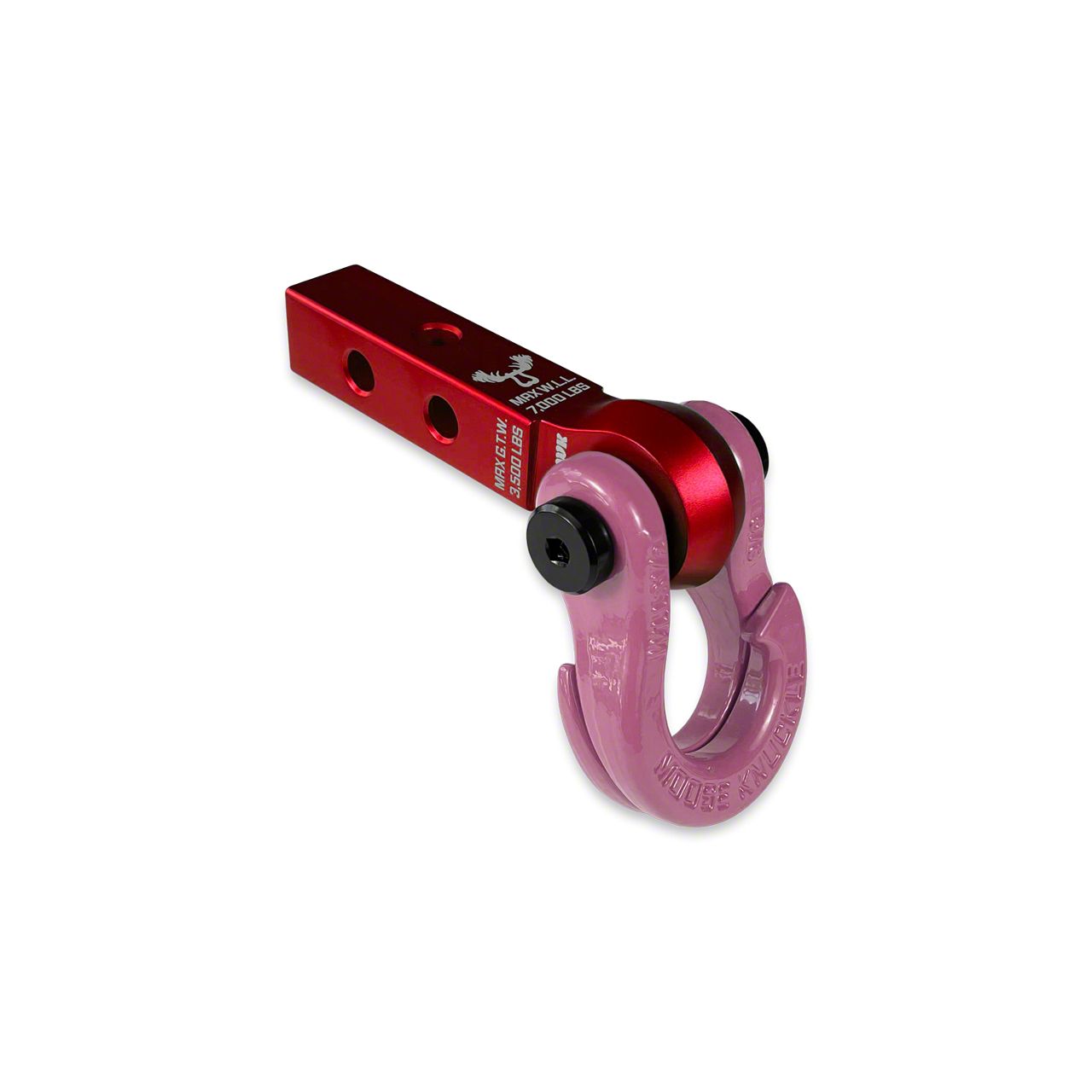 This shackle receiver set up is perfect for your SxS, UTV or ATV with a 1.25 inch hitch tube!JOWL 5/8 SPLIT SHACKLEIntroducing the "patent pending" JOWL SxS 5/8 inch recovery split shackle designed especially for smaller off-road vehicle like SxS's, ATV's and UTV's. Our innovative split "J" recovery shackle design eliminates the need for tools or soft shackles while making rope and strap connections faster eliminating the need to remove your shackles from your bumper or hitch receiver to make a connection, hook up a rope or strap out on the trail. Fast TOOL-LESS closed loop recovery finally made easy!!THIS CHANGES EVERYTHING!Just open up the Jowl shackle hooked sides, insert your recovery rope or tow strap looped end, rotate the end of the tow rope or strap to engage both sides of the shackle, pull tight and you are ready to recover your stuck vehicle.We designed our smaller 5/8 Jowl SxS with a standard bow shackle shape for those SxS, ATV, UTV and Off-roaders who prefer a more traditional shackle look on their rigs. Built in pull angle stops are visual reminders that give you feedback to help you keep your pull angles low keeping your recovery safe and as efficient as possible.The Jowl SxS Recovery Shackle fits any 1.25 or 2.0 inch tow shackle receiver, soft shackle receiver hitch bracket mount or bumper tow point with a 3/4" (0.75") pin hole and a mounting bracket width of 1 inch (1.0") or less.All color options are fully interchangeable. Buy two different color shackles and combine them to match the color scheme of your rig and give your build a more custom accented look. The hooked sides are fully covered with a durable powder coating pantone color matched to popular truck and Jeep colors. The shackle pin is Black Nickel plated and machined from High Strength Grade 8 Carbon Steel.This 3.5T (7,000 LB WLL) forged carbon steel shackle is guaranteed to speed up vehicle recovery so you can spend more time enjoying the trail instead or being stuck in it.Built in rubber anti-chatter pads stop the hooked sides from rattling against each other as you navigate the roughest trails.Each shackle includes six durable nylon shackle isolators. Two 3.0mm thick washers, two 2.0mm thick washers and two 1.0mm washers help you center your Jowl shackle on any width bumper shackle mount, gusset, wench rope or shackle receiver.We made mounting the Jowl easy. The shackle pin is secured by two Metric M14 cap screws that accept any 1/4" socket wrench. Just grab two 1/4 inch ratchets and easily remove or attach the shackle to your vehicle without the need to find the correct allen keys or hex wrenches out on the trail. (Bonus: only one screw needs to be removed to attach or remove the shackle from your vehicle adding to the speed and functionality of this design.)Mohawk Receiver 1.25 - Red RumHang your Moose Knuckle Offroad shackle or tow shackle from our new versatile SxS, ATV and UTV shackle hitch receiver.The Mohawk 1.25 is warm forged using 6082 aluminum with the grain flow orientated to maximize the strength of your connection point providing a work load limit of 7,000lbs.Two hitch pin holes allow for two receiver mounting positions increasing compatibility with any 1.25 inch hitch mounting tube. The third hitch pin hole and included spacer allow you to rotate the receiver 90 degrees so you can mount a hitch ball with a 3/4" shank providing a towing tongue weight limit of 300lbs and a gross trailer weight of 3,500lbs while accepting a Class I/II hitch ball.Most shackle receivers have sharp edges at the connection point which often tear soft shackles, synthetic ropes, tree savers and strap looped ends. The Mohawk 1.25 main mounting hole has a very large radius on the outer edges to reduce abrasion and increase the life of your recovery gear making this ideal for use with any closed loop recovery set up. The spined outer perimeter adds more material where you need it most and gives the Mohawk its aggressive and unique identity.Shackle Specs:Color: Pogo PinkItem: 5/8 Anchor ShacklePin Style: ScrewWLL (Working Load Limit): 7,000 lbs.MBS (Minimum Breaking Strength): 35,000 lbs. (17.5t)FoS (Factor of Safety): 5:1Width Between Eyes: 1.06 inches (1.06")Finish: Powder CoatedPin Finish: Black Nickel PlatedPin Diameter: 3/4" (0.75")Thread Size: M14 x 2.0mm - 6H/6gPin Material: Grade 8 Carbon SteelBody Material: Chromoly SteelPATENT PENDINGThe "Raw Dog" uncoated option is ready to add primer and paint or powder coating so you can color match your vehicle or just add any finish of your choosing. Only the Jowl hooked bodies should be powder coated, not the pin. Coating the pin will hinder the assembly functionality. (***Please note: this option will show signs of weathering and rust if left uncoated.)Receiver Specs:Material: Warm Forged 6082 AluminumColor: Red RumReceiver Tube Size: 1.25 inchHitch Pin Holes Size: 1/2" (0.50")Shackle Compatibility: 5/8" shackles with 3/4" pin diameter using provided spacer and 3/4" shackles with 7/8" pin diameter without provided spacer.Coating: UV and Weather Proof Anodized Black w/ Laser etched LogosWLL (Work Load Limit): 3.5T or 7,000lbsG.T.W. (Gross Trailer Weight): 3,500lbsT.W. (Tongue Weight): 300lbsBall Hitch Size: Spacer included to accept Class I / II hitch balls with 3/4" shank dia.