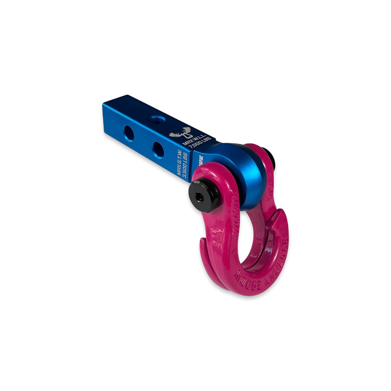 This shackle receiver set up is perfect for your SxS, UTV or ATV with a 1.25 inch hitch tube!JOWL 5/8 SPLIT SHACKLEIntroducing the "patent pending" JOWL SxS 5/8 inch recovery split shackle designed especially for smaller off-road vehicle like SxS's, ATV's and UTV's. Our innovative split "J" recovery shackle design eliminates the need for tools or soft shackles while making rope and strap connections faster eliminating the need to remove your shackles from your bumper or hitch receiver to make a connection, hook up a rope or strap out on the trail. Fast TOOL-LESS closed loop recovery finally made easy!!THIS CHANGES EVERYTHING!Just open up the Jowl shackle hooked sides, insert your recovery rope or tow strap looped end, rotate the end of the tow rope or strap to engage both sides of the shackle, pull tight and you are ready to recover your stuck vehicle.We designed our smaller 5/8 Jowl SxS with a standard bow shackle shape for those SxS, ATV, UTV and Off-roaders who prefer a more traditional shackle look on their rigs. Built in pull angle stops are visual reminders that give you feedback to help you keep your pull angles low keeping your recovery safe and as efficient as possible.The Jowl SxS Recovery Shackle fits any 1.25 or 2.0 inch tow shackle receiver, soft shackle receiver hitch bracket mount or bumper tow point with a 3/4" (0.75") pin hole and a mounting bracket width of 1 inch (1.0") or less.All color options are fully interchangeable. Buy two different color shackles and combine them to match the color scheme of your rig and give your build a more custom accented look. The hooked sides are fully covered with a durable powder coating pantone color matched to popular truck and Jeep colors. The shackle pin is Black Nickel plated and machined from High Strength Grade 8 Carbon Steel.This 3.5T (7,000 LB WLL) forged carbon steel shackle is guaranteed to speed up vehicle recovery so you can spend more time enjoying the trail instead or being stuck in it.Built in rubber anti-chatter pads stop the hooked sides from rattling against each other as you navigate the roughest trails.Each shackle includes six durable nylon shackle isolators. Two 3.0mm thick washers, two 2.0mm thick washers and two 1.0mm washers help you center your Jowl shackle on any width bumper shackle mount, gusset, wench rope or shackle receiver.We made mounting the Jowl easy. The shackle pin is secured by two Metric M14 cap screws that accept any 1/4" socket wrench. Just grab two 1/4 inch ratchets and easily remove or attach the shackle to your vehicle without the need to find the correct allen keys or hex wrenches out on the trail. (Bonus: only one screw needs to be removed to attach or remove the shackle from your vehicle adding to the speed and functionality of this design.)Mohawk Receiver 1.25 - Blue PillHang your Moose Knuckle Offroad shackle or tow shackle from our new versatile SxS, ATV and UTV shackle hitch receiver.The Mohawk 1.25 is warm forged using 6082 aluminum with the grain flow orientated to maximize the strength of your connection point providing a work load limit of 7,000lbs.Two hitch pin holes allow for two receiver mounting positions increasing compatibility with any 1.25 inch hitch mounting tube. The third hitch pin hole and included spacer allow you to rotate the receiver 90 degrees so you can mount a hitch ball with a 3/4" shank providing a towing tongue weight limit of 300lbs and a gross trailer weight of 3,500lbs while accepting a Class I/II hitch ball.Most shackle receivers have sharp edges at the connection point which often tear soft shackles, synthetic ropes, tree savers and strap looped ends. The Mohawk 1.25 main mounting hole has a very large radius on the outer edges to reduce abrasion and increase the life of your recovery gear making this ideal for use with any closed loop recovery set up. The spined outer perimeter adds more material where you need it most and gives the Mohawk its aggressive and unique identity.Shackle Specs:Colo