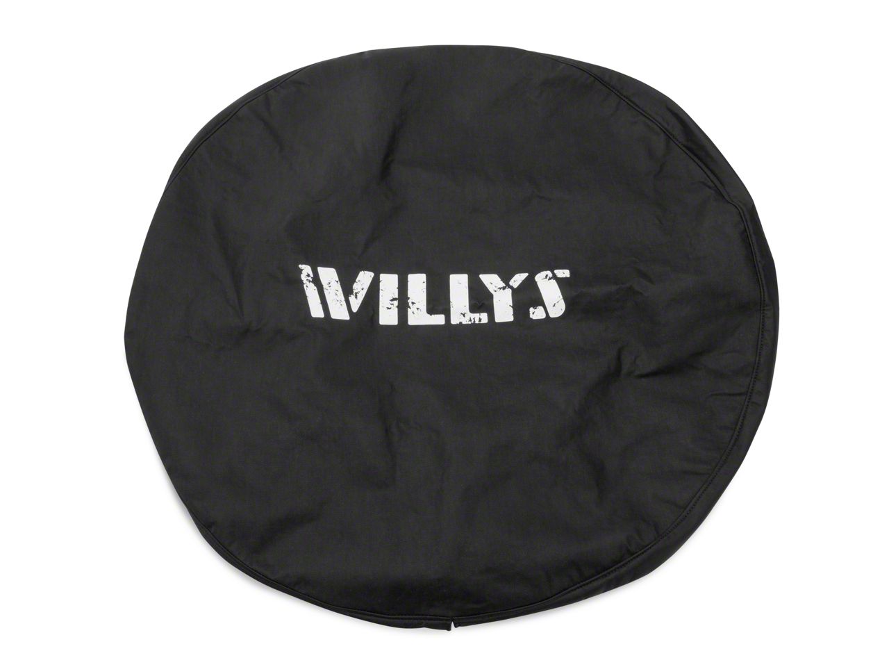 The Willys distressed logo is printed in white on this black denim cotton/polyester blend tire cover and features heavy duty stitching.