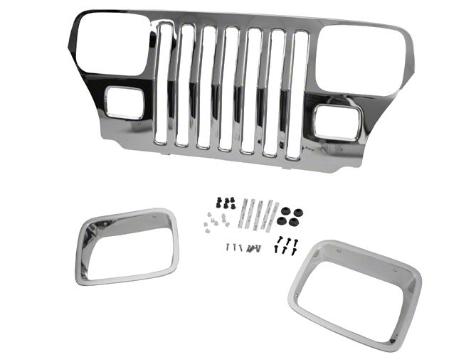 Key Features. Liven up the front end of your Jeep with this dramatic Mopar grille Overlay. Don't keep rolling around with the same faded, cracking and tired old grille, which does nothing to complement the wonderful machine you own. The chrome finish on this overaly will definitely get your rig noticed, no matter if you're cruising down main street or hitting a tough trail. When you get your vehicle's front dirty with mud or other grime, all it takes is a quick washing and you restore the same high-end look. Since this overlay is backed by a 5 year warranty and was made to OE specifications, you can rest easy it will stay in good shape for a long time.