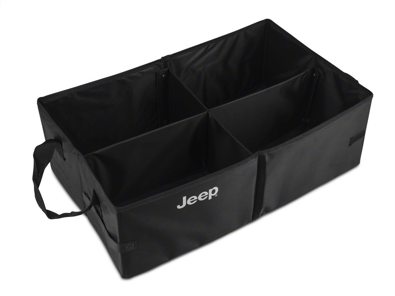Inexpensive Organization. This Mopar Collapsible Cargo Tote with Jeep Logo is divided into for compartments for convenience. It is easily portable, folds out to 24"x15" and is the perfect storage unit for anything you'll keep in your Jeep Cherokee.
