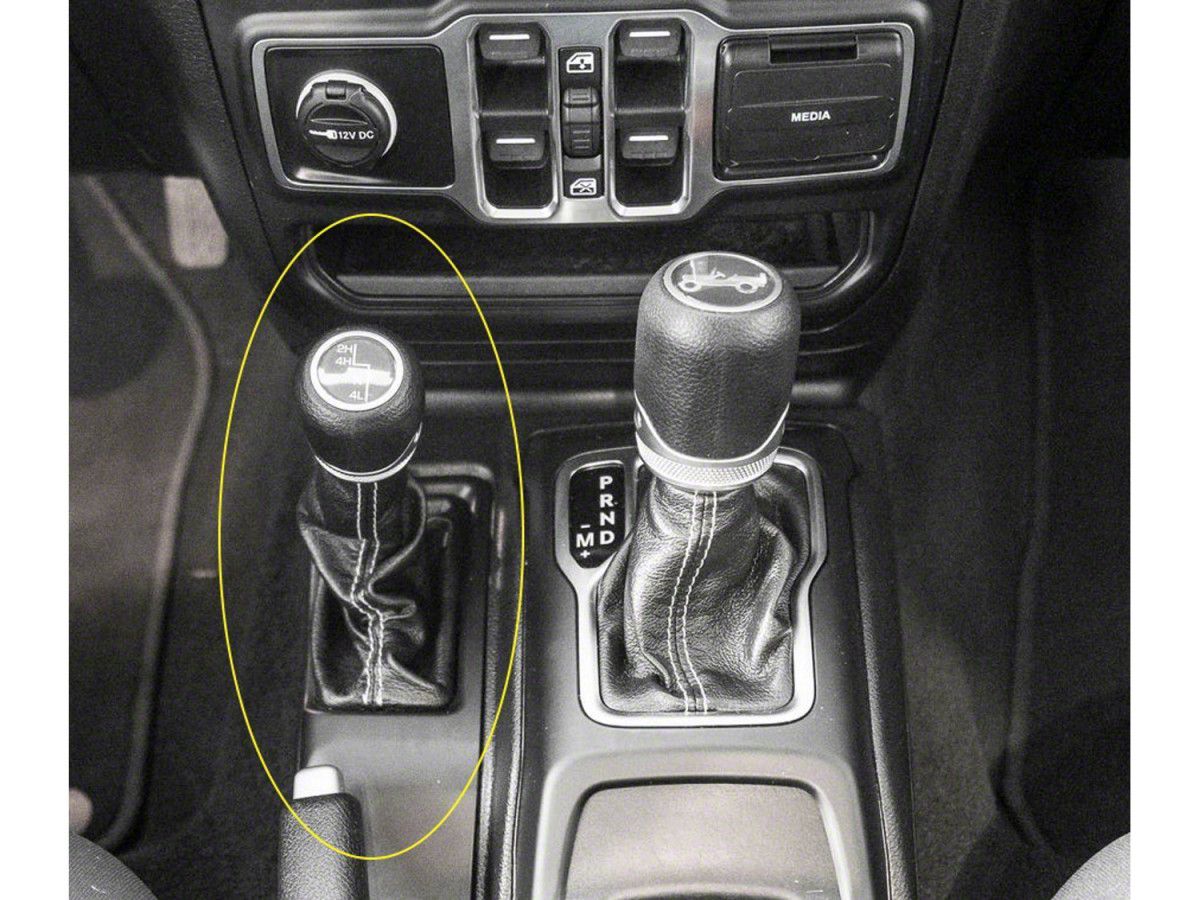 Application. The Mopar Transfer Case Shift Knob and Boot; Black Leather with White Stitching fits all 2020-2026 Jeep Gladiator JT models.