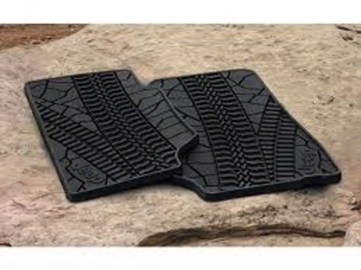 Premium All-Weather Protection. The Mopar All-Weather Front Floor Mats with Jeep Logo; Black provide superior defense against water, snow, and mud, keeping your vehicle's interior clean and well-maintained. Designed for front-row use, these mats are essential for preserving the carpet under harsh weather conditions while displaying the iconic Jeep brand logo.