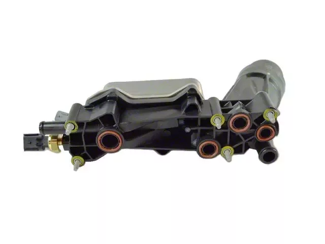 Construction and Appearance. This Mopar assembly features durable high-temperature plastic and metal components built to withstand engine bay heat and pressure. It includes an integrated oil cooler and filter mount, with a black and silver finish that matches OEM appearance and construction standards.