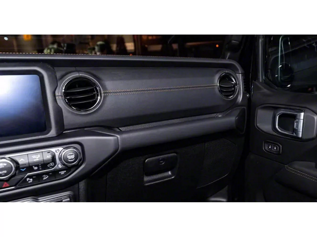 Application. This Mopar Passenger Side Dashboard Panel Trim in Black Leather with Caramel Stitching fits all 2018-2026 Jeep Wrangler JL models.