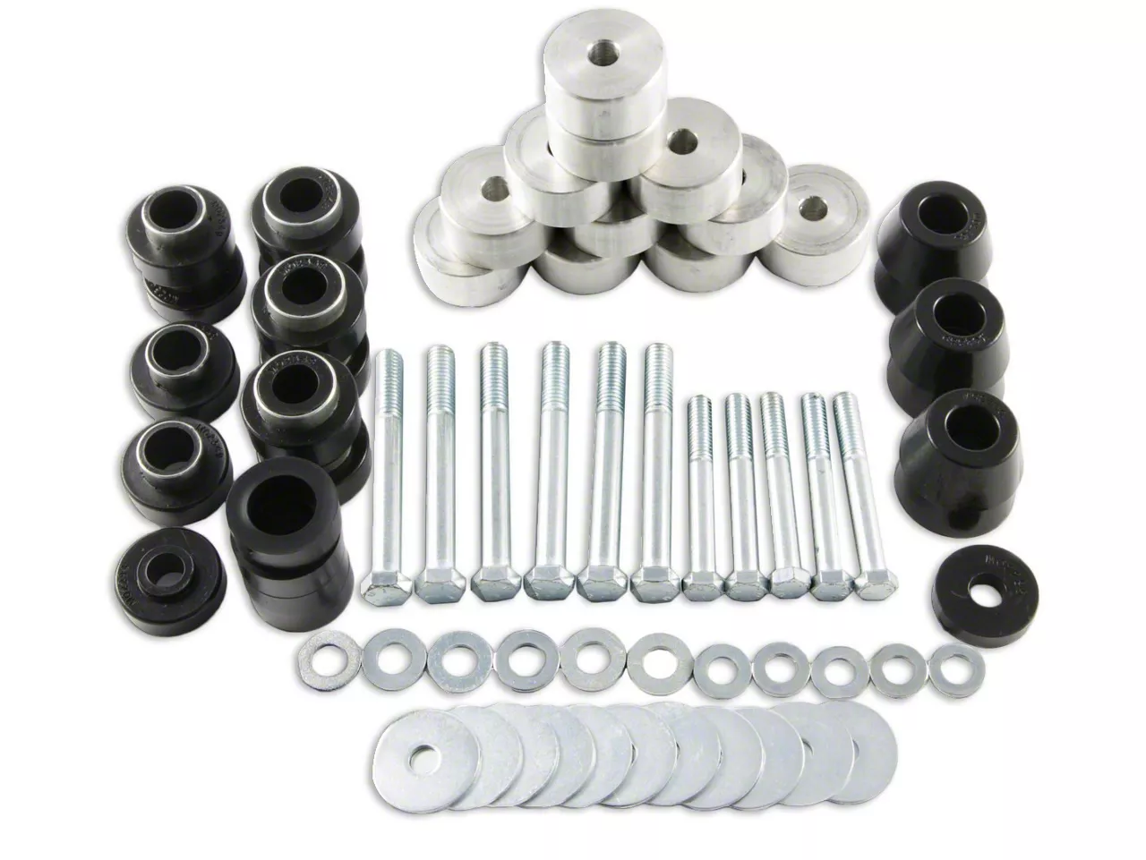 Full Installation Kit. This kit includes everything you’ll need for a full installation, including new polyurethane body mounts to replace the old rubber body mounts that first came with your Jeep. The upgraded body mounts are flexible yet tough. Installation delivers a 1-inch body lift.