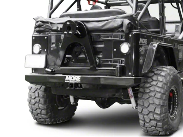 Superior Protection. The M.O.R.E. Rock Proof Rear Bumper with Tire Carrier – Black is the ideal addition for your Jeep Wrangler YJ. It was designed to have wrap-around corners to ensure superior protection from rock rash when you take to the trails on all your off-road adventures. The bumper features a 2-inch integrated receiver hitch that includes safety chain hooks.