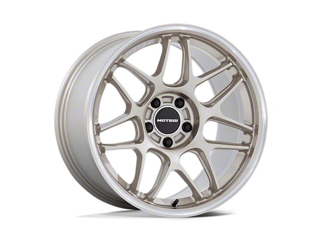 Motegi Tsubaki Motorsport Gold with Machined Lip Wheel; 19x8.5 The Motegi Tsubaki Motorsport Gold with Machined Lip Wheel combines a sleek, sophisticated design with premium construction that enhances the visual appeal and complements a wide range of vehicle styles. This wheel is perfect for those seeking to make a bold statement while maintaining elegance and robustness.