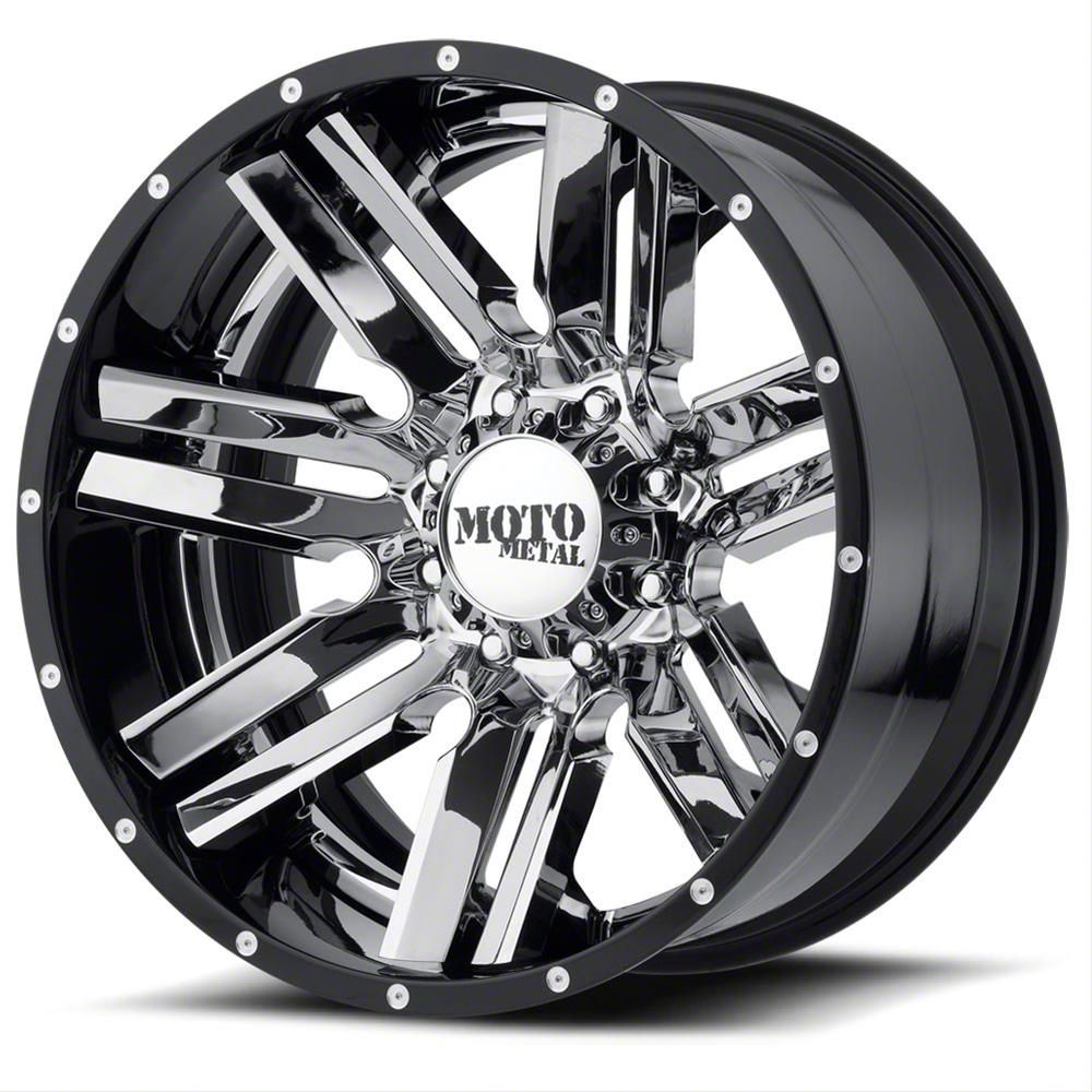The 20x10 Moto Metal MO202 Chrome Center with Gloss Black Milled Lip 6-Lug Wheel; 20x10; -18mm Offset is completed in a sturdy, stunning finish that will be the envy of everyone. The finish has been thoroughly tested to make sure it can handle the rigors of daily driving.