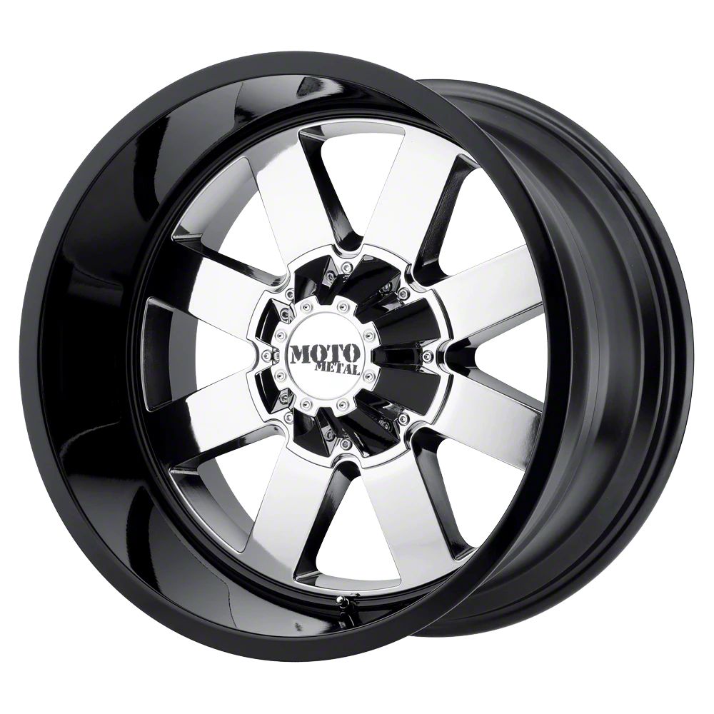 The 22x10 Moto Metal MO962 PVD Chrome Center with Gloss Black Lip Wheel is completed in a high-quality chrome finish with gloss black milled accents for an aggressive appearance that will turn heads. This wheel features a durable clear coat that stands up to the hazards of everyday driving.