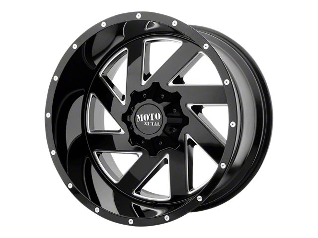 The 20x10 Moto Metal Melee Gloss Black Milled Wheel is completed in a high-quality gloss black finish with steel milled accents for an aggressive appearance that will turn heads. This wheel features a durable clear coat that stands up to the hazards of everyday driving.