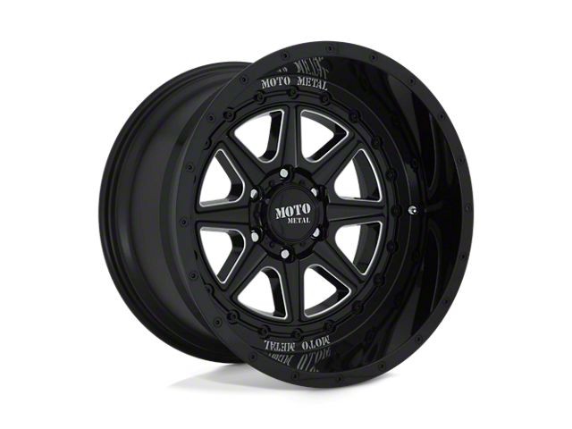 Moto Metal Phantom Gloss Black Milled Wheel; 22x12 The Moto Metal Phantom Gloss Black Milled Wheel combines a sleek, sophisticated design with premium construction that enhances the visual appeal and complements a wide range of vehicle styles. This wheel is perfect for those seeking to make a bold statement while maintaining elegance and robustness.